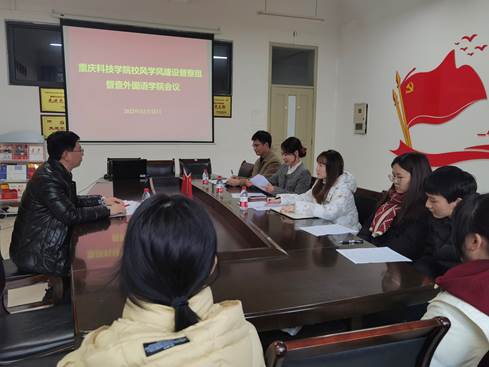 2023年12月23日上午,校风学风建设督察组第四组于桂宝组长前往外国语学院,在厚德楼H206会议室开展校风学风督察。外国语学院副处级组织员陶兰,全体专兼职辅导员参加了学风建设督察座谈会,学院5名学生代表参加了访谈调研活动。